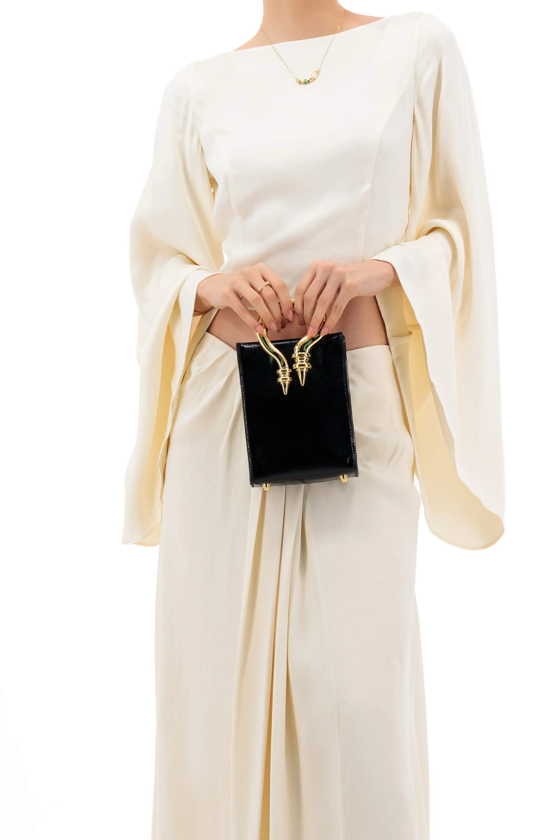 The Mini Shopper Bag - a stunning piece of artistry that seamlessly blends strength and softness. With its unique, irregularly shaped brass handle, this bag is a symbol of the power of metal that can be molded and shaped into something beautiful. The handle's structural form is a visual representation of strength.