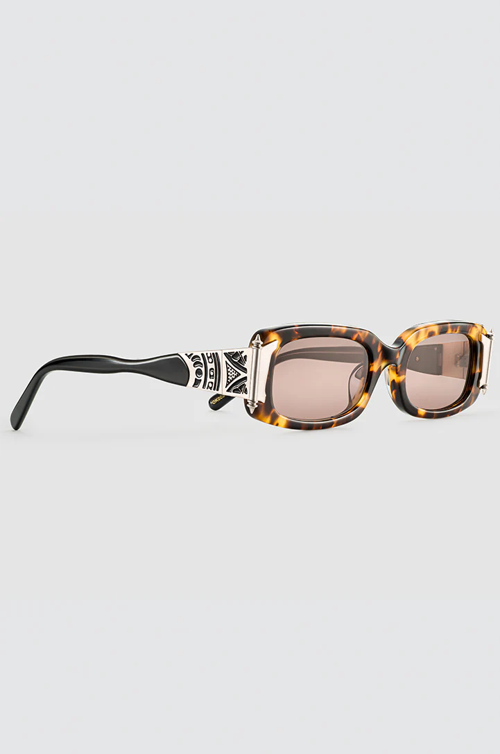 The Maya mimics a minimal nineties look in a tortoise colorway with tobacco lens. The slim line oval silhouette features an iconic OKHTEIN rod handle that is made of brass engraved with the label’s palmette leaf flower, attached to a plexi handle. This piece features straight arms with curved tips and a single nose bridge.